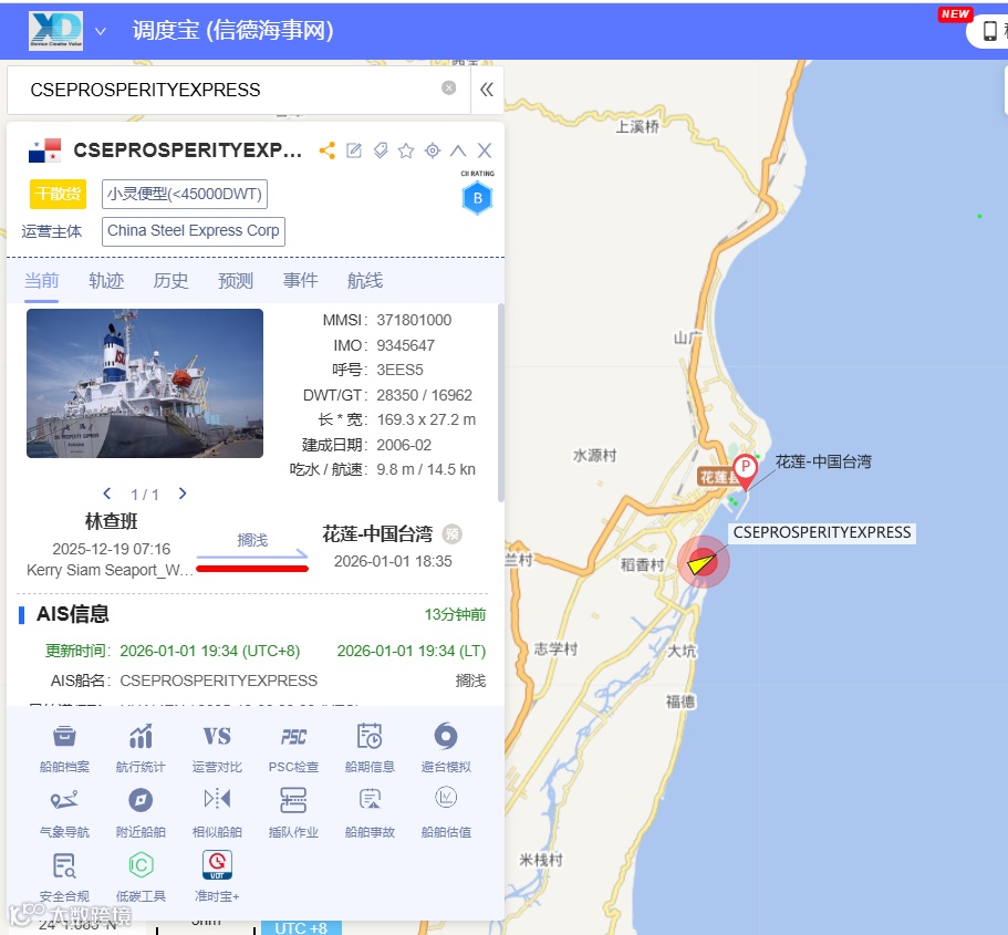 据媒体报道,1月1日,巴拿马籍干散货船“通鸿轮”(CSE PROSPERITY EXPRESS)在计划进靠台湾花莲港卸货前发生主机故障。船舶在外海等候引水登轮期间失去动力,叠加东北季风及恶劣海况影响,船体持续南漂,最终在花莲溪出海口北侧、化仁海堤附近搁浅。