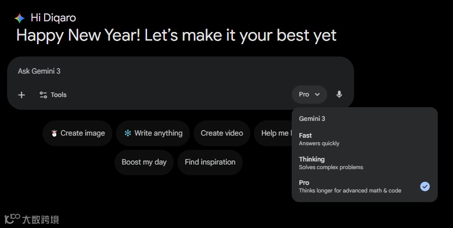 尤其是它的 Pro 会员,可以同时拥有 Gemini 3 Thinking、Nano Banana Pro 和 Veo 3.1 使用权限,三位一体,都是顶级。