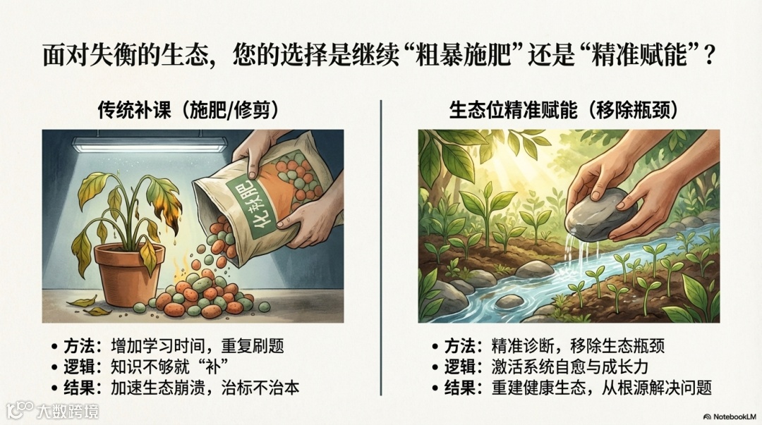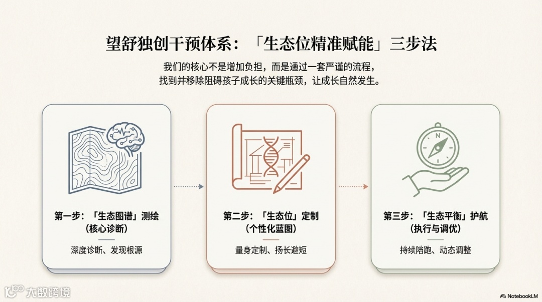 面对失衡的生态,粗暴“施肥”(补课)或“修剪”(施压)只会加速崩溃。何源老师带领的望舒团队,采用独创的 「生态位精准赋能」干预体系,其核心不是增加负担,而是通过精准诊断,移除生态瓶颈,激活系统自愈与成长力。