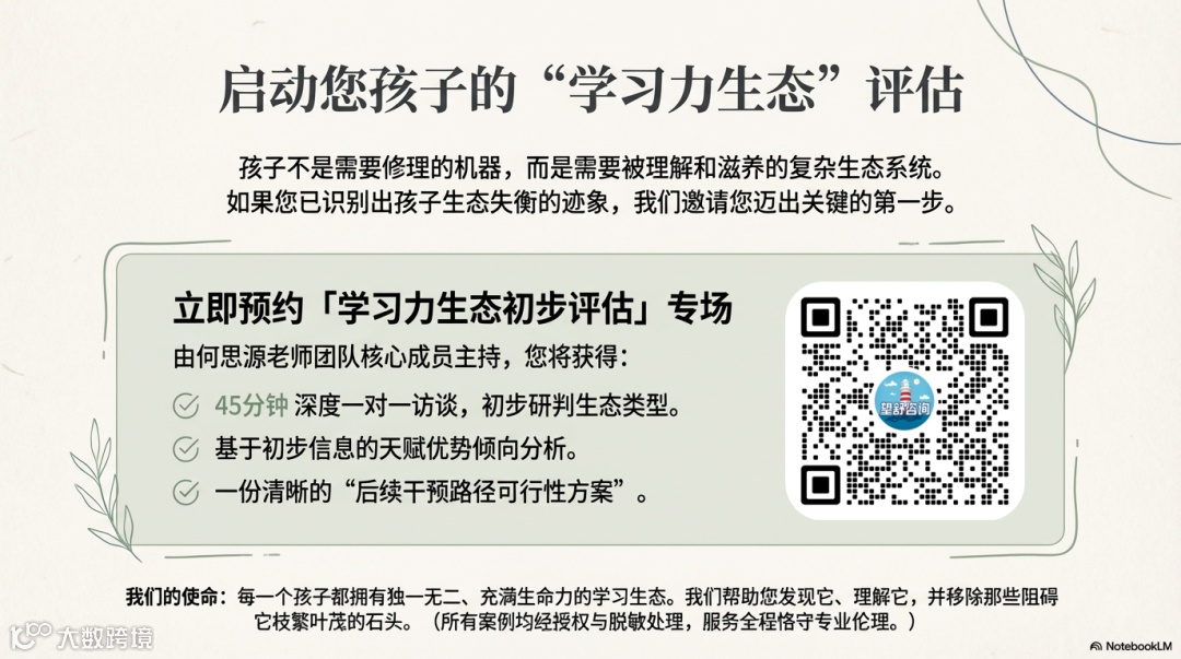 理念声明:本文倡导的“学习力生态”观,源于何源老师整合超个人心理学、积极心理学及教育神经科学的实践总结。所有案例均经深度脱敏与授权。我们尊重成长的复杂性,不提供简单的“成功保证”,而是致力于通过专业合作,最大程度激发个体内在的成长潜能。服务全程恪守专业伦理。