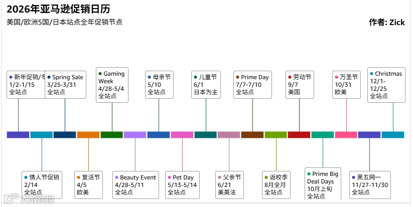 新年伊始,又到了卖家朋友们规划全年营销节奏的关键时刻, Zick经理将为您详细梳理美国、欧洲五国(英国、德国、法国、意大利、西班牙)以及日本站点的26年全年促销节点,助您精准布局,赢在起跑线!