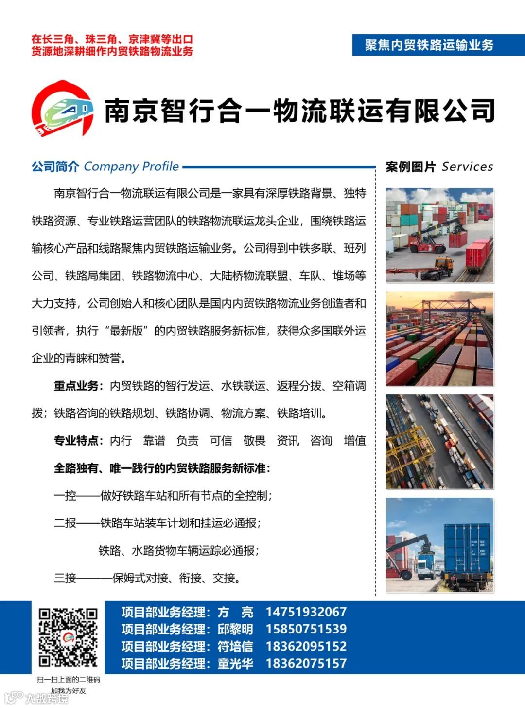 南京智行合一物流联运有限公司是一家具有深厚铁路背景、独特铁路资源和专业运营团队的铁路物流联运龙头企业,专注于内贸铁路运输业务。公司依托中铁多联、班列公司、铁路局集团、铁路物流中心及大陆桥物流联盟等多方支持,由国内内贸铁路物流领域的开创者与引领者组建核心团队,执行“最新版”内贸铁路服务标准,赢得众多国联外运企业的广泛认可。