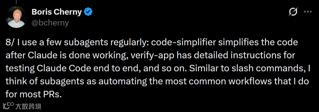 8. 构建子代理体系(subagents),例如code-simplifier负责代码精简,verify-app执行端到端测试,封装PR高频操作;