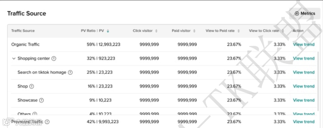 - 流量溯源:清晰标注各渠道带来的曝光量、点击量、成交人数及对应转化率。