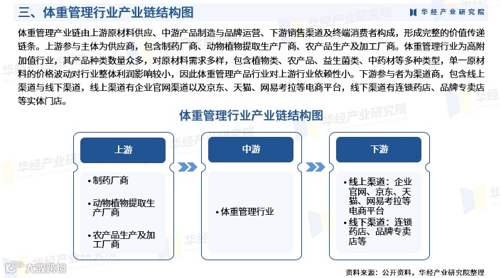 体重管理产业链由上游原材料供应、中游产品制造与品牌运营、下游销售渠道及终端消费者构成。上游主要包括制药企业、动植物提取物生产商及农产品加工企业;下游渠道分为线上与线下,线上涵盖企业官网及京东、天猫等电商平台,线下包括连锁药店、品牌专卖店等实体门店。