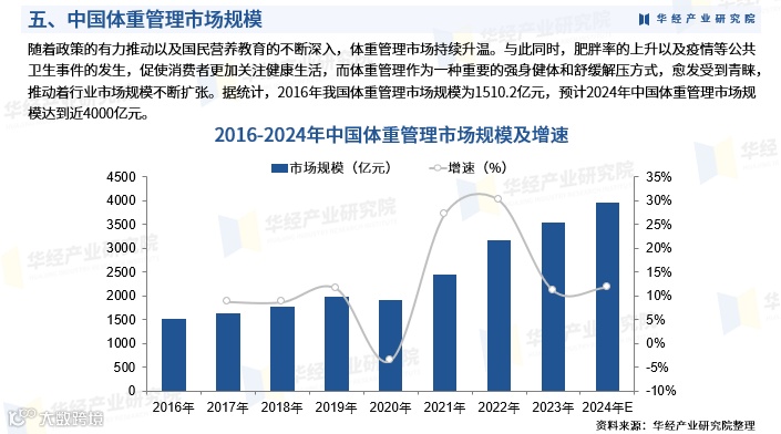数据显示,2016年中国体重管理市场规模为1510.2亿元,预计2024年将接近4000亿元,行业发展潜力巨大。