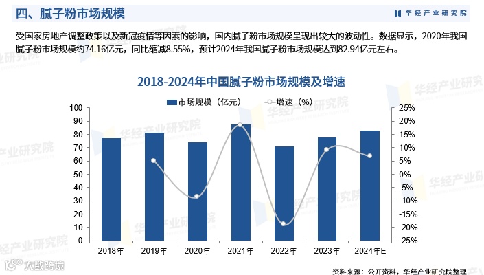 受房地产调控及疫情影响,国内腻子粉市场经历波动。数据显示,2020年市场规模约为74.16亿元,同比下降8.55%。预计到2024年,市场规模将回升至约82.94亿元,呈现稳步复苏态势。