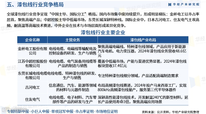 全球漆包线市场呈现“中国主导、国际分工”的格局。国内市场竞争梯队分明:金杯电工占据高端市场领先地位,中超控股主攻中低端市场,东莞长城专注特种线领域。国际方面,日本古河电工、住友电气在高频、耐高温等高端技术领域具备优势,中外企业形成差异化竞争态势。