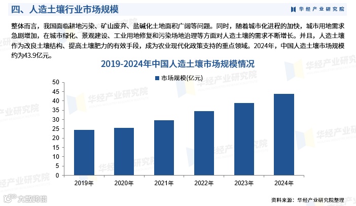 我国面临耕地污染、矿山废弃地多、盐碱化土地面积大等问题,叠加城市化进程加快,推动城市绿化、景观建设及污染场地治理对人造土壤需求持续上升。作为改良土壤结构、提升地力的重要手段,人造土壤已被纳入农业现代化重点支持方向。2024年,中国人造土壤市场规模约为43.9亿元。