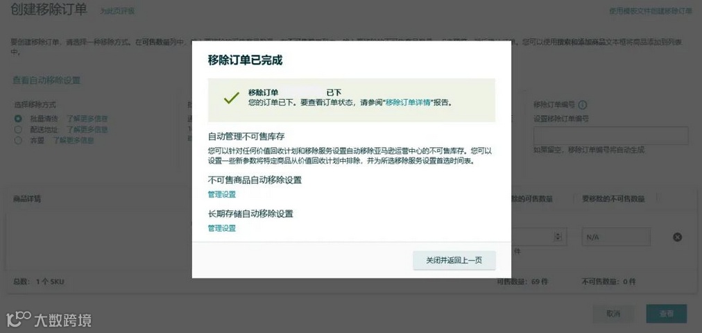 - 选择需移除的ASIN,点击“创建移除订单”