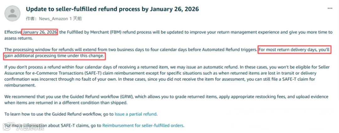 亚马逊FBM退款新规将于2026年1月26日正式生效,核心围绕退款时效、自动退款及SAFE-T理赔资格做出重要调整。