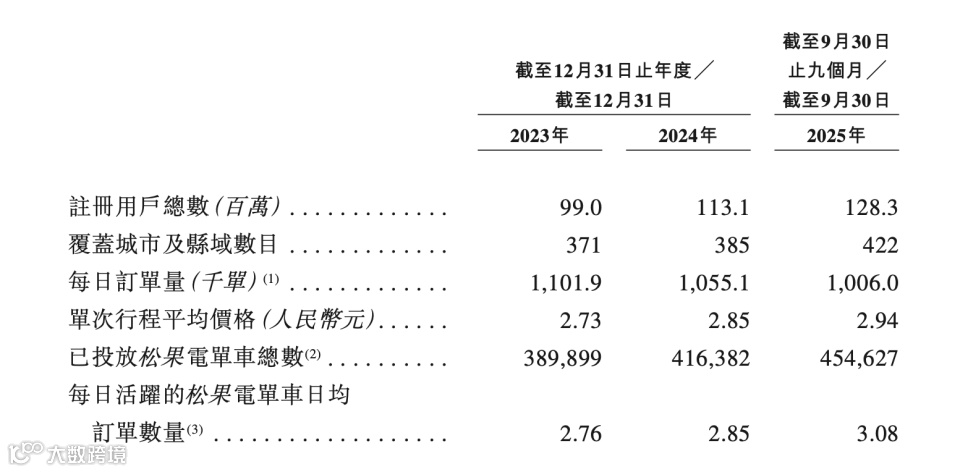 其中,截至2023年12月31日、2024年12月31日以及2025年9月30日,松果出行的网络覆盖范围已分别从371个市县增加至385个市县,并进一步增加至422个市县;注册用户总数则从截至2023年12月31日的0.99亿增至截至2024年12月31日的1.13亿、并进一步攀升至截至2025年9月30日的1.28亿。