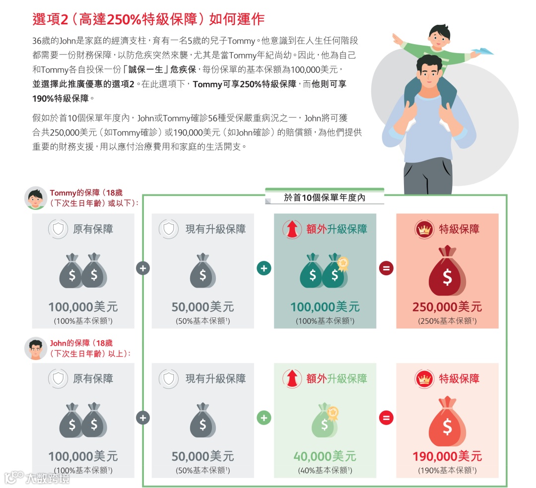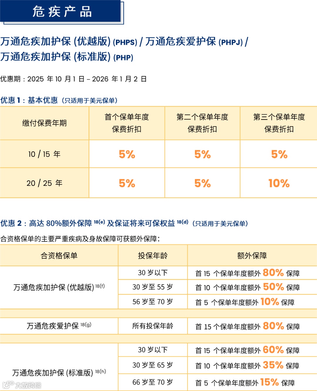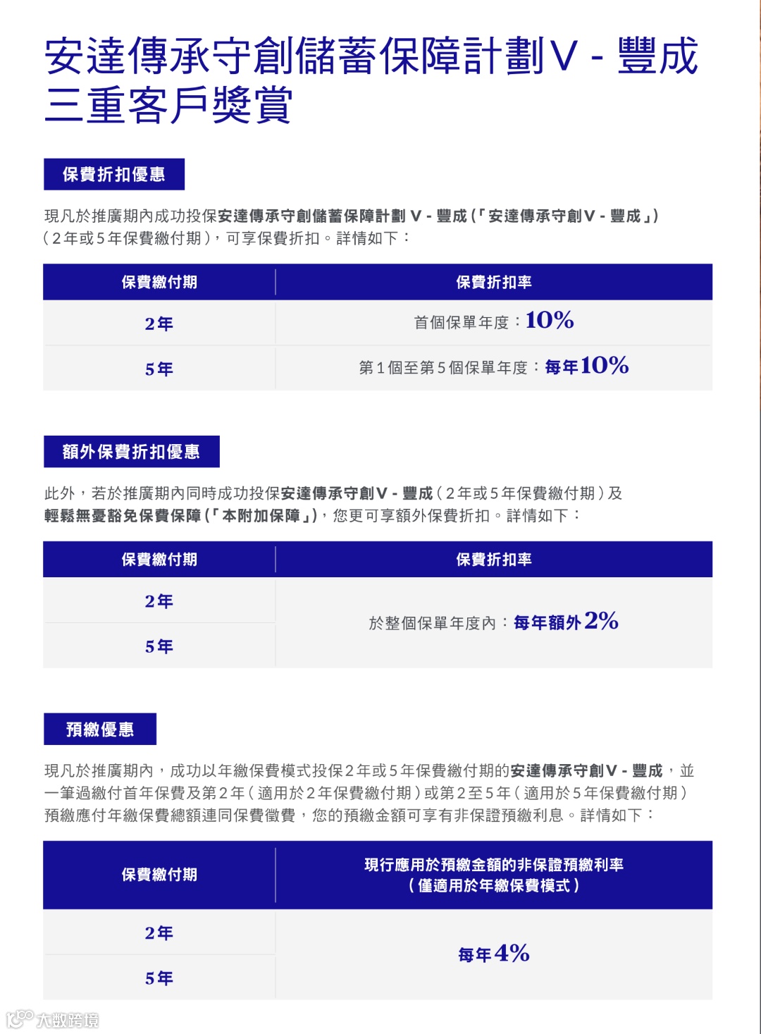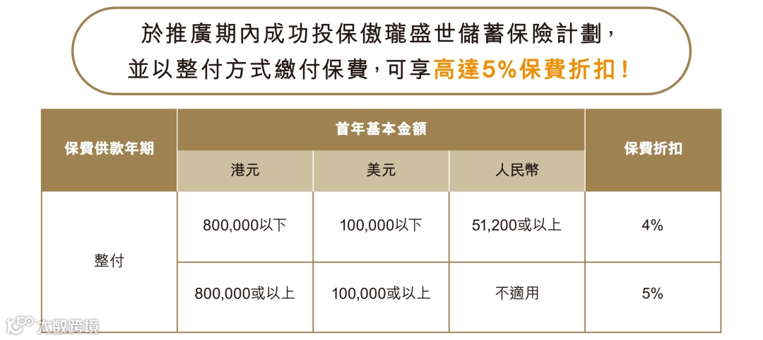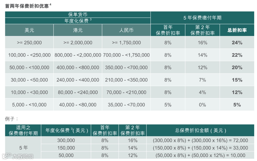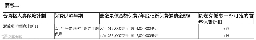 保费≥256,000美元或2,000,000港元(2/3年缴费期),额外享1%-2%首年保费折扣