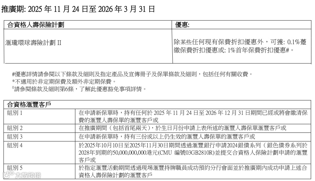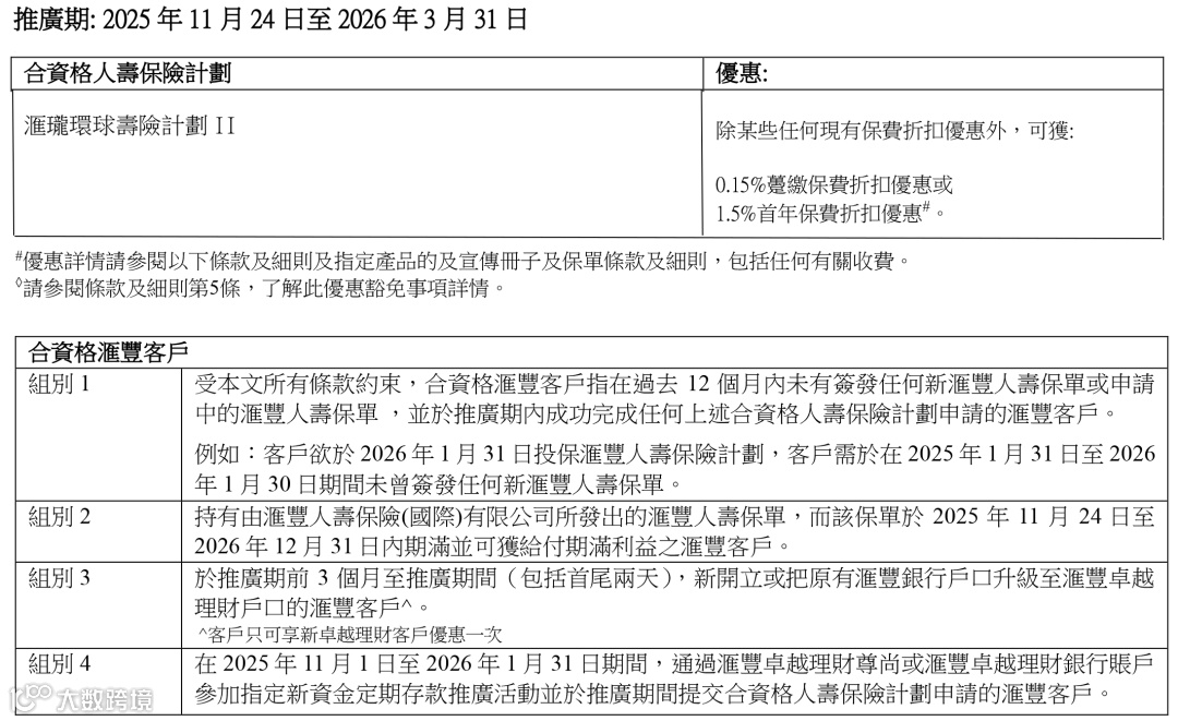 如果1年内没申请过任何新的汇丰人寿保单,或者已持有的汇丰人寿保单于2025年11月24日-2026年12月31日内期满并获给付期满利益,或者新开立/把原有汇丰银行账户升级为汇丰卓越理财户口,额外享0.15%(趸缴)或1.5%(期缴)保费折扣优惠。