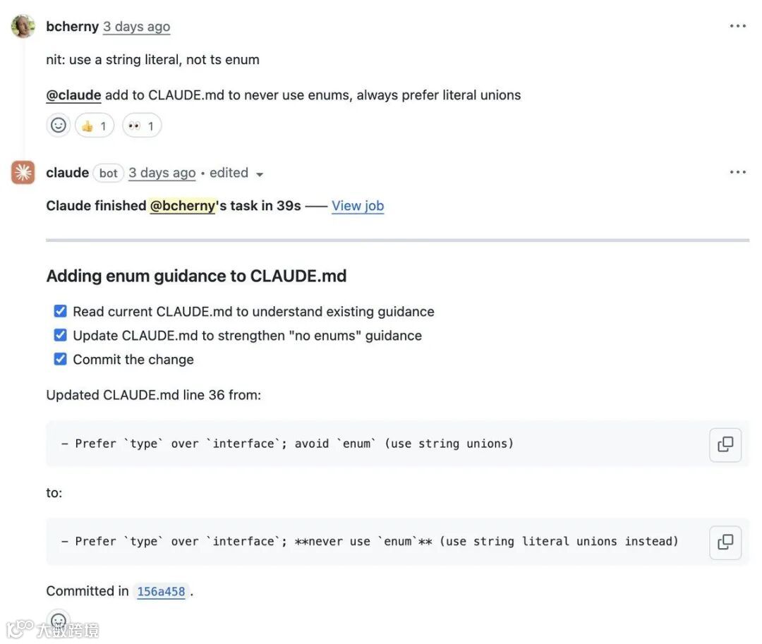 代码审查时,Boris 常在拉取请求中标记 @.claude,建议将问题与改进同步提交至 CLAUDE.md;流程由 Claude Code GitHub Action(/install-github-action)自动化支撑。