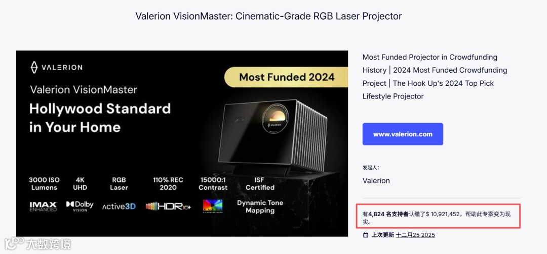 速度持续增长。 基于此趋势,Andy在美国创立AWOL Vision,并推出高端子品牌Valerion。AWOL Vision聚焦短焦投影,Valerion则主打长焦产品,形成覆盖全球中高端家庭用户的完整矩阵。与多数出海企业依赖成本优势不同,Valerion自创立之初便将重心放在用户需求挖掘与体验升级上。 2023年初,Valerion首次亮相即引发质疑,但很快凭借实力扭转局面。其在Kickstarter平台发起众筹,45天内斩获1092万美元,吸引4824名支持者,创下行业众筹纪录,迅速成为高端家庭影院领域的“现象级”品牌。