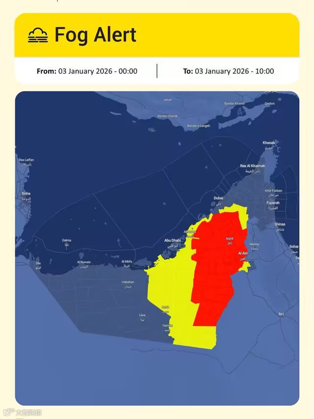 周六清晨,浓雾笼罩阿布扎比、迪拜及阿联酋其他地区,国家气象中心(NCM)已在多个区域发布红色与黄色大雾预警,预计能见度低下情况将持续至1月3日(周六)上午10:30。部分区域能见度已降至1000米以下,阿布扎比警方随即在数条主干道实施限速80公里/小时的措施。