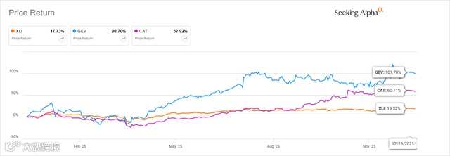 工业板块中,GE Vernova与卡特彼勒表现领先,主因深度参与AI数据中心电力与动力系统建设。
