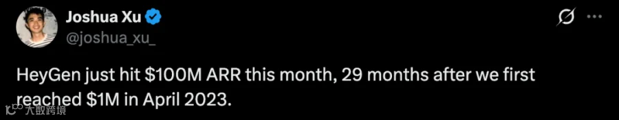 Suno(2022年成立)与HeyGen(2020年成立)分别以AI音乐与AI视频切入娱乐消费。Suno于2025年10月达成1亿美元ARR;HeyGen创始人Joshua Xu于2025年10月在𝕏平台确认公司ARR首次破亿。