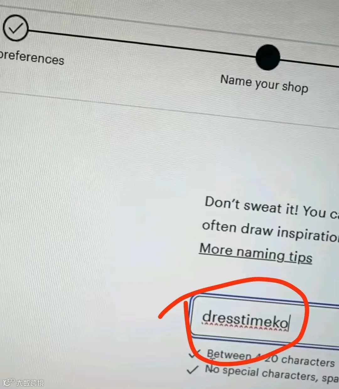 接下来就是进入填写店铺名字,需要在4-20个英文字母之内,且不能和平台上现有的店铺名重复,店铺名通过审核之后,下方会有两个小√。