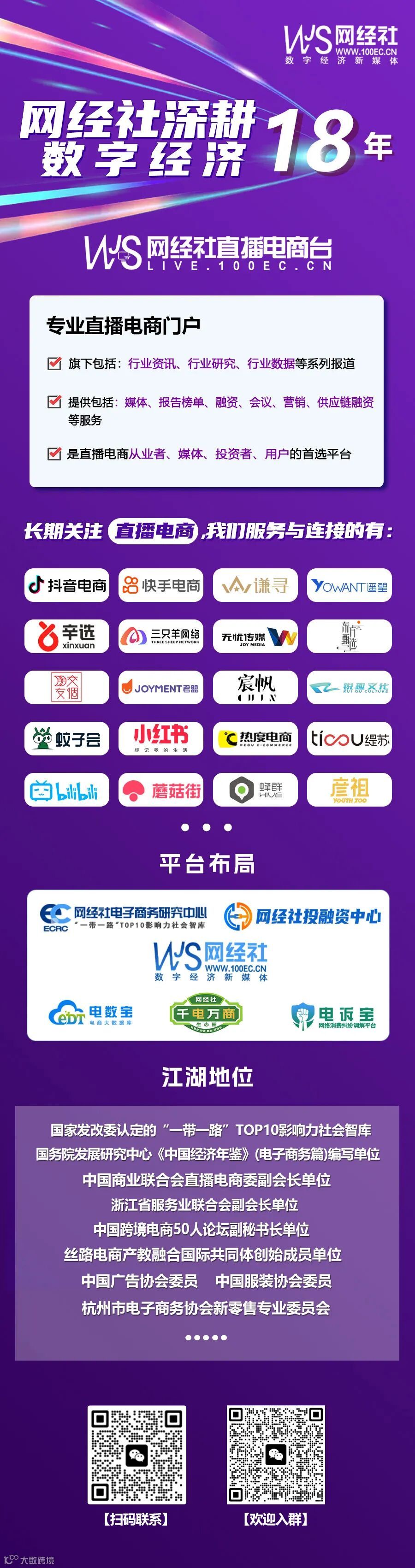 网经社直播电商台(LIVE.100EC.CN)是一站式直播电商门户,旗下运营:行业资讯、行业研究、行业数据等系列频道,提供包括:媒体、报告榜单、融资、会议、营销、培训、供应链融资等服务,是数字零售从业者、媒体、投资者的首选平台。