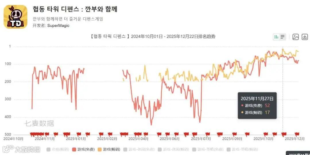 「韩国毒厂」111%去年10月在小号测试的一款塔防游戏《협동 타워 디펜스 : 깐부와 함께(合作塔防:与钢布一起)》,近几个月来排名突然蹿升,近日最高曾达到韩国iOS畅销榜第17名。而在刚上线的前半年里,游戏甚至几乎没进入过TOP200。