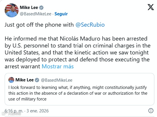 “他告知我,尼古拉斯·马杜罗已被美方人员逮捕,将在美国接受刑事指控审判,而今夜我们所见的军事行动旨在保护和捍卫执行逮捕令的人员,”李参议员在谈及与卢比奥的对话时如是说。