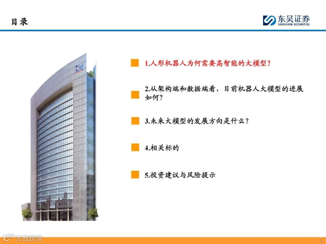 东吴证券发布的《机器人大模型行业深度报告》聚焦人形机器人智能化的核心瓶颈,围绕“为何需要高智能大模型”“当前技术进展如何”“未来发展方向是什么”三大问题,系统分析具身智能大模型的技术架构、数据支撑、产业格局与投资机会。报告指出,人形机器人产业化落地的关键在于突破传统工业机器人“控制刚、泛化弱”的局限,而具身智能大模型正是实现环境理解与适应能力的核心驱动力。目前行业整体处于L2初级阶段,迈向通用泛化智能仍需在建模方法、数据规模和训练范式等方面持续突破。