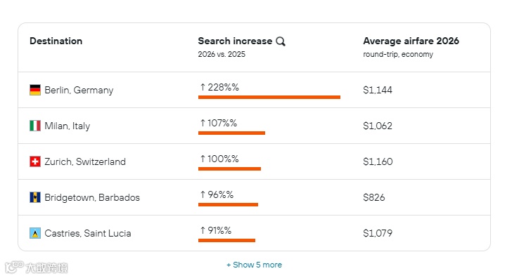 在加拿大2026年十大热门旅行目的地中,欧洲占7席,其中柏林、米兰搜索热度位居前列 [6] 。