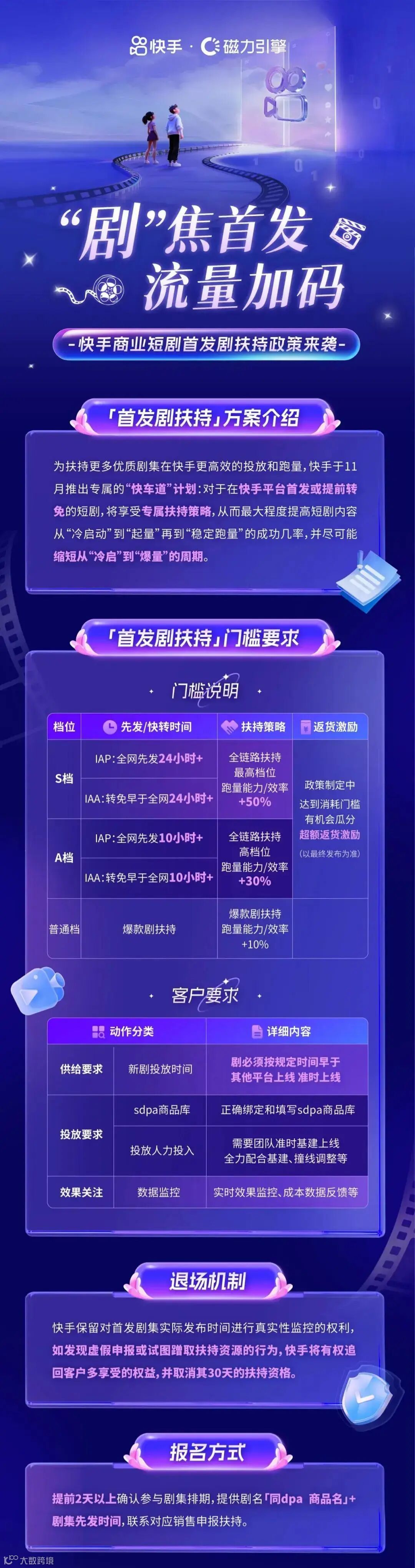 ■机构激励:全网首发优质剧集,最高4% 额外投流返点+2 万元现金奖励(月消耗≥2 万)