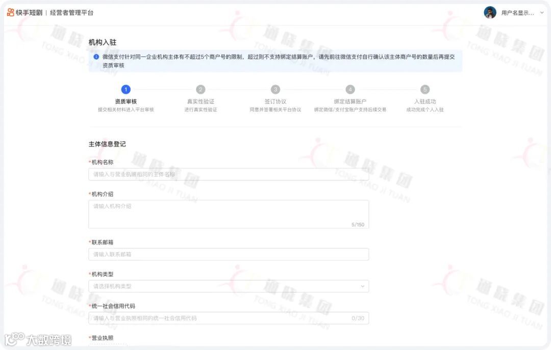 按照要求填写信息,提供营业执照/法人身份证等信息