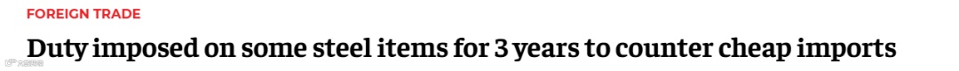 印度财政部一则公告称,将对部分进口钢铁产品征收为期三年保障性关税,第一年税率为12%,随后两年逐渐降至11%。