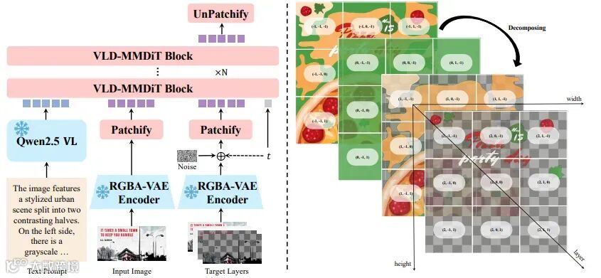 左图:VLD-MMDiT(可变层分解 MMDiT)示意图,其中输入 RGB 图像和目标 RGBA 层均由我们提出的 RGBA-VAE 进行编码。在注意力计算过程中,这两个序列沿序列维度连接,从而增强层间和层内交互。 -