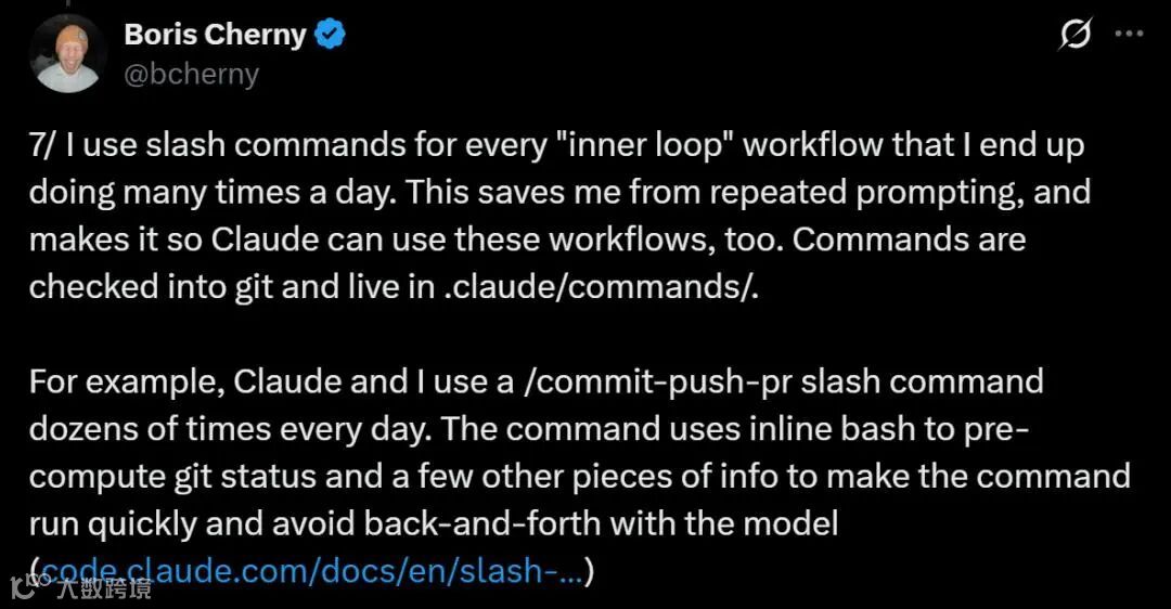 Boris将高频重复的"内循环"操作固化为斜杠命令,既省去重复编写提示词的繁琐,也让Claude能直接调用这些工作流。以/commit-push-pr为例,日均使用数十次的背后,是命令内嵌的bash脚本预计算git状态等信息,大幅提速并免去了与模型的来回确认。