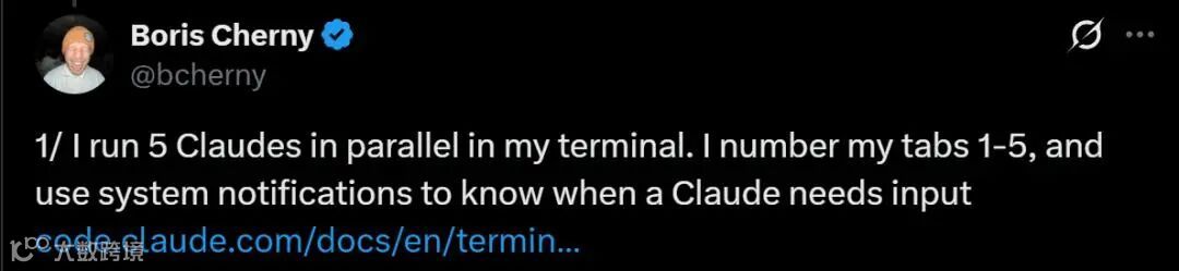出乎意料,这个配置异常简单。Claude Code开箱即用且效果好,因此Boris Cherny很少自定义。步骤:在终端并行运行5个Claude。