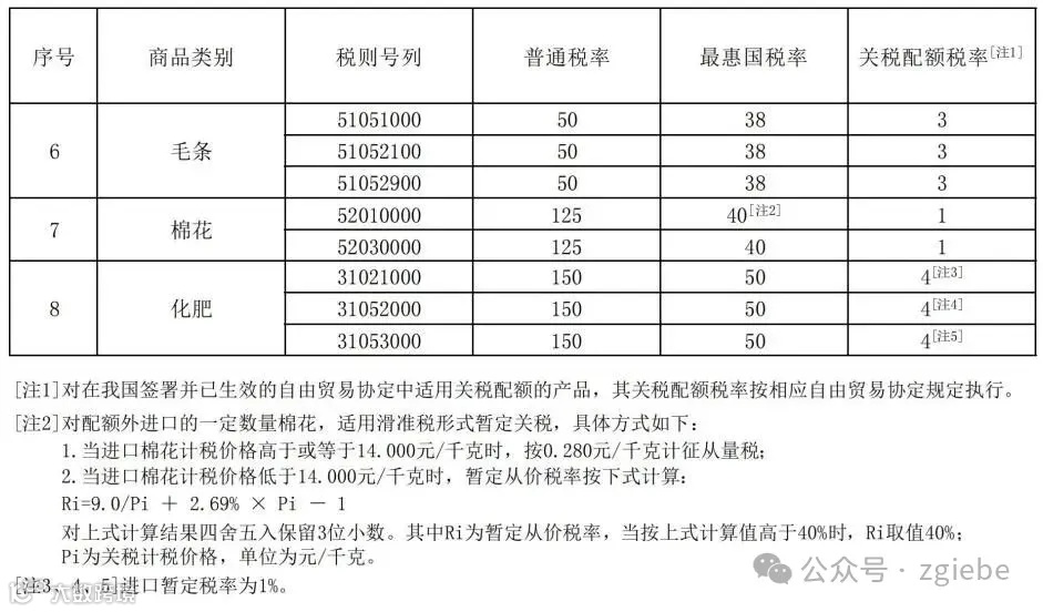 继续对小麦等8类商品实施关税配额管理,税率维持不变。其中,尿素、复合肥、磷酸氢铵3种化肥配额内税率继续执行1%;棉花配额外进口继续适用滑准税。