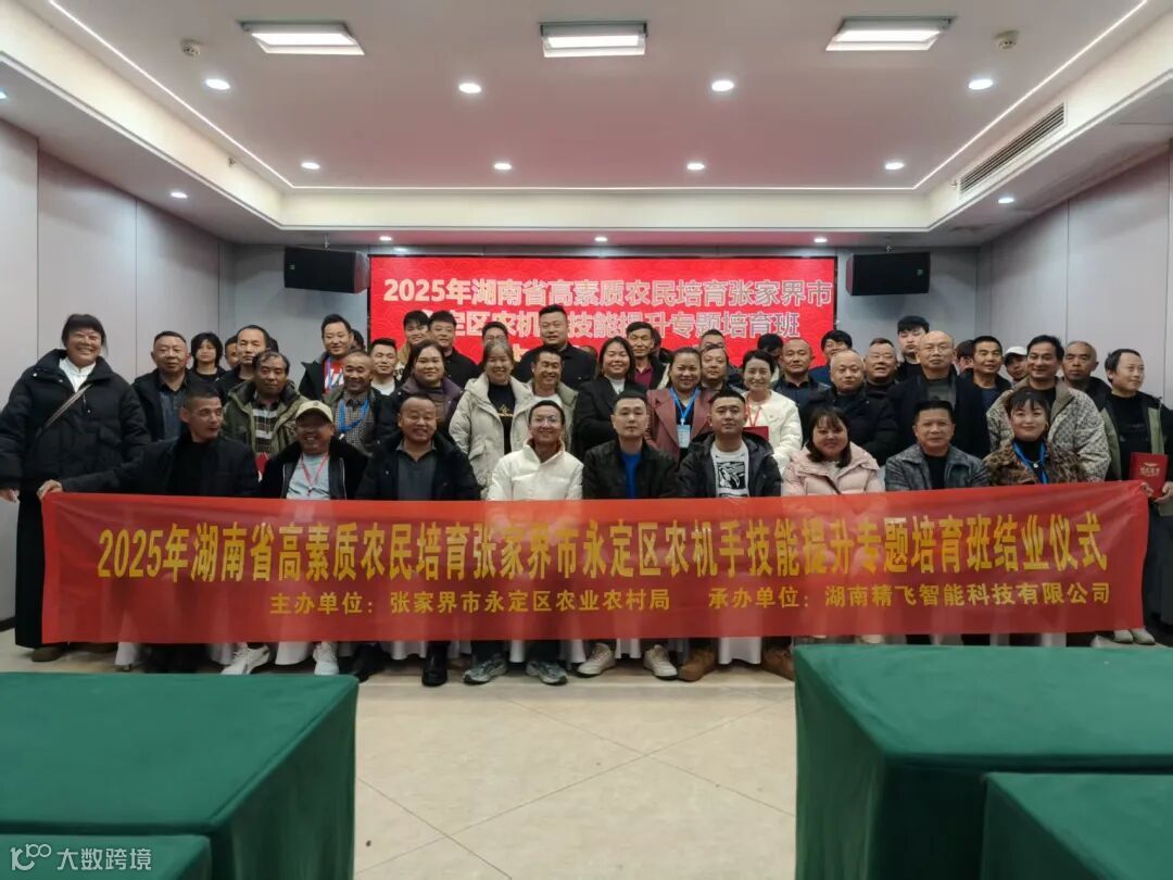 2026年1月2日,由张家界市永定区农业农村局主办、湖南精飞智能科技有限公司承办的“2025年湖南省高素质农民培育张家界市永定区农机手技能提升培训专题班”圆满结业。本次培训历时120学时(2025年12月19日至2026年1月2日),吸引永定区各乡镇50余名农机手、农机大户及农机作业服务组织带头人参与。