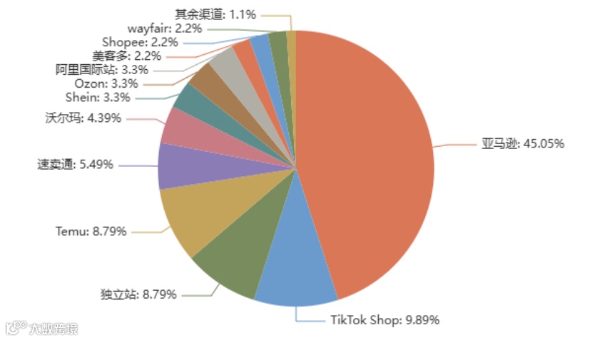 渠道格局呈现“一超多强”特征:亚马逊以45%的占比遥遥领先,凭借庞大用户基础、成熟FBA体系及平台信誉,持续巩固核心出海通道地位。