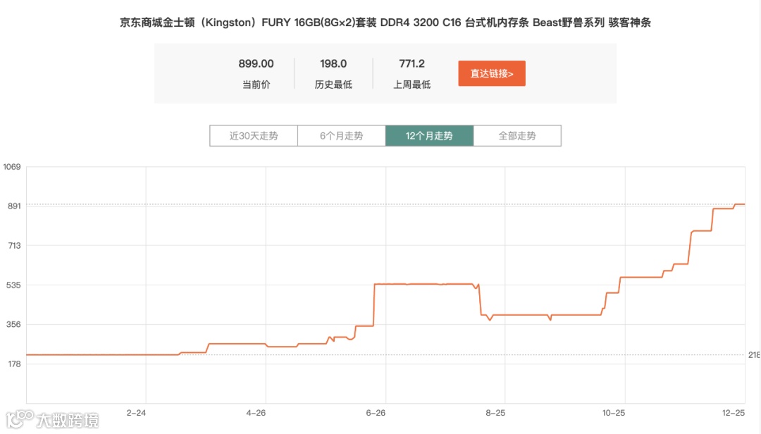 以主流8GB DDR4-3200内存条为例,涨价前均价约70元;截至2025年12月中旬,报价已飙升至约350元,涨幅超280%。金士顿某款8GB×2套装京东价达899元,年初仅为219元。两根16GB内存成本激增,单台DIY装机成本普遍上涨六七百元。