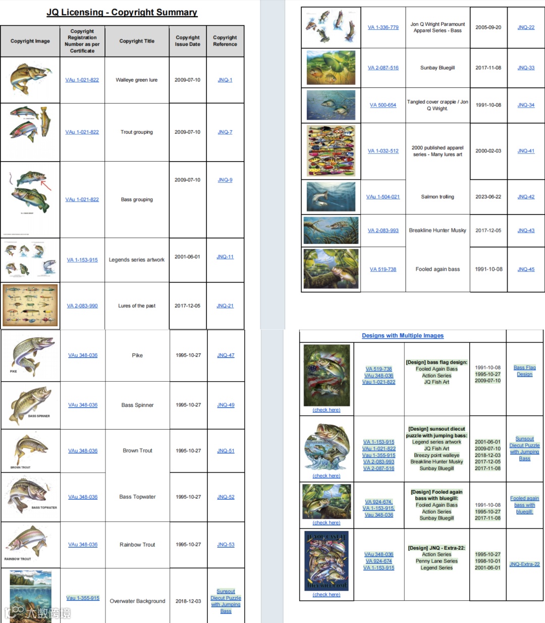 本次案件维权商标JQ Licensing(注册号:未公开,注册类别:第42类,涵盖商业艺术设计服务、艺术作品授权、数字内容创作等)。维权版权20个鱼类主题艺术图案(包括“Bass Master”“Trout Legend”等系列),均已完成美国版权局(USCO)登记,登记号可公开查询。直接使用JQ Licensing商标或艺术家Jon Q. Wright姓名作为品牌名;本案集中针对Temu平台,但卖家需警惕其他平台(如亚马逊、eBay)的潜在风险。据Allen团队统计,近期已有12起类似案件在跨平台蔓延,涉及家居装饰、服饰配饰等类目。