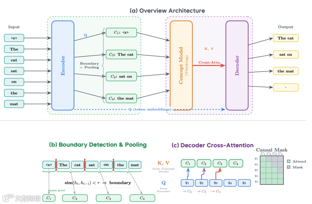 字节跳动Seed团队与英国曼彻斯特大学、加拿大Mila研究所、清华大学等机构联合发布Dynamic Large Concept Models(DLCM),首次把“概念级”理写进大模型主干:模型不再逐token预测,而是先在隐空间把文本切成可变长“概念”,再在压缩后的概念序列上做深度推理,最后用交叉注意力还原成词。