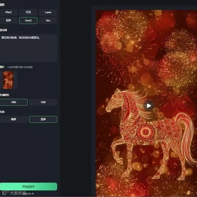 提示词:“小马奔跑着路过了烟花场景,舞狮场景,团圆饭场景。”