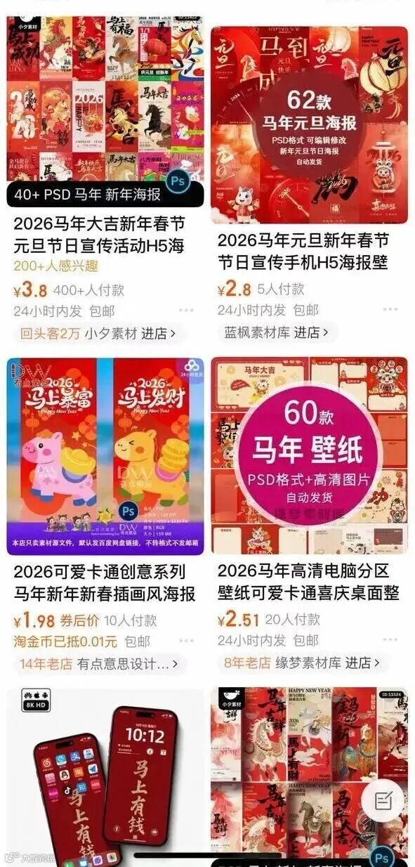 购物平台上的马年红包封面和海报售卖