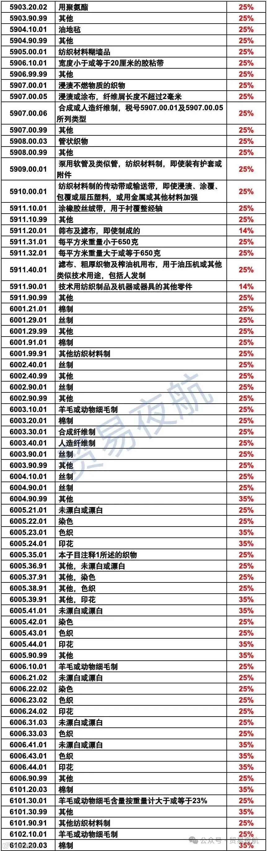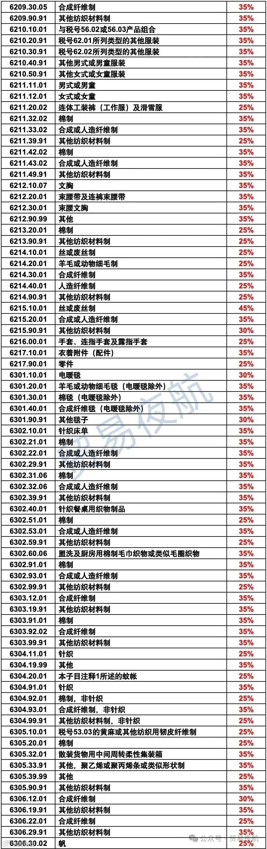 ●纺织、服装、鞋类:税率 20%-35%;