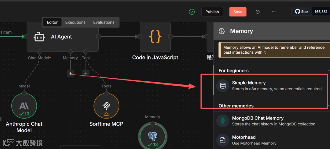 工作流默认启用Postgres Chat Memory作为Agent记忆模块,支持本地持久化存储会话上下文。因涉及复杂Docker配置,本期暂不展开;卖家可临时切换为n8n内置Simple Memory替代——注意该模式仅在工作流运行期间有效,退出即清除,重要对话请自行存档。