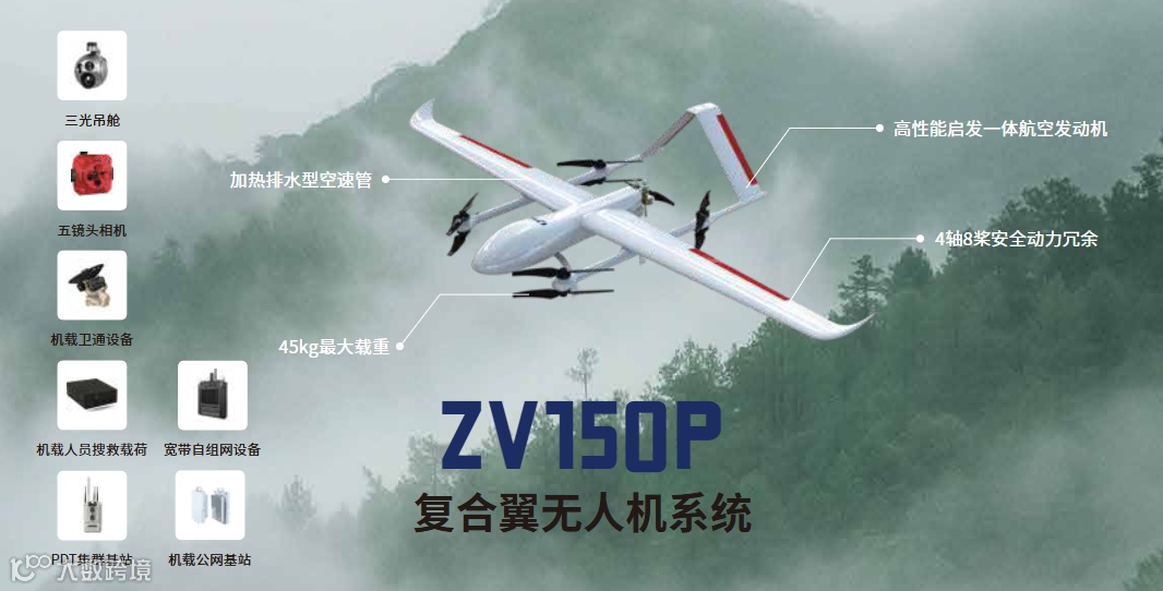 ZV150P为卓翼智能全栈自研智能无人系统,适用于应急通信、巡查巡防、物资运输、海事监测、森林消防等多场景。搭载油电混合动力系统,具备6小时续航与45kg大载重能力;高海拔、高低温、小雨等严苛环境下均可稳定飞行,抗风等级达6级,支持“展开即飞”。该机型已入选《国家重要电力应急产品推广名录》(2025),成为国家电力应急保障体系核心装备。