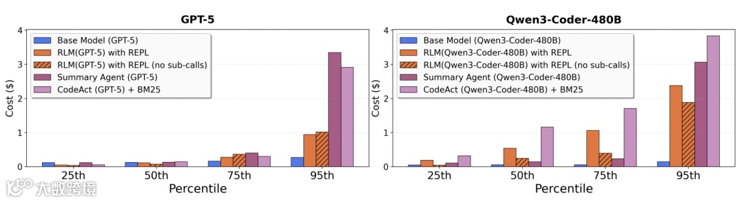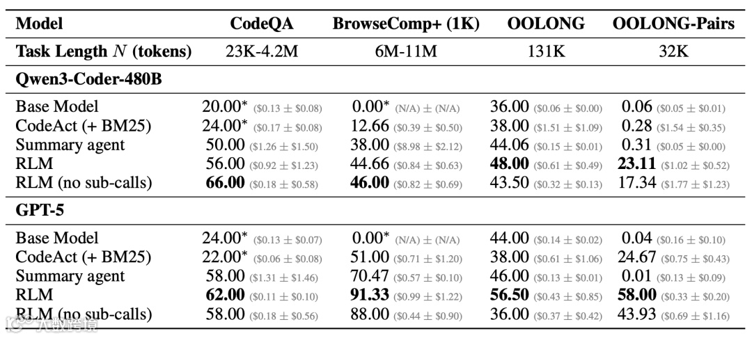 RLM实测支持最高1000万Token输入,在BrowseComp-Plus等基准中,GPT-5-mini+RLM处理600万–1100万Token平均成本仅0.99美元,低于全量阅读方案(1.50–2.75美元)及摘要压缩方案。