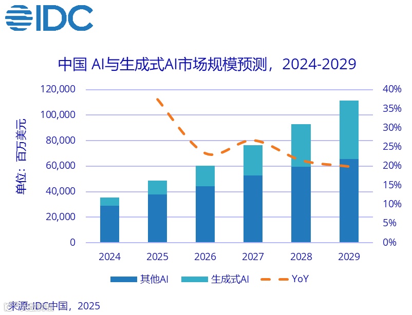 IDC报告显示,2024年中国生成式AI投资占整体AI市场投资的18.2%;预计2029年该比例将升至41.1%,投资规模超450亿美元,五年复合增长率达48.0%。整体人工智能总投资规模预计2029年达1114亿美元。