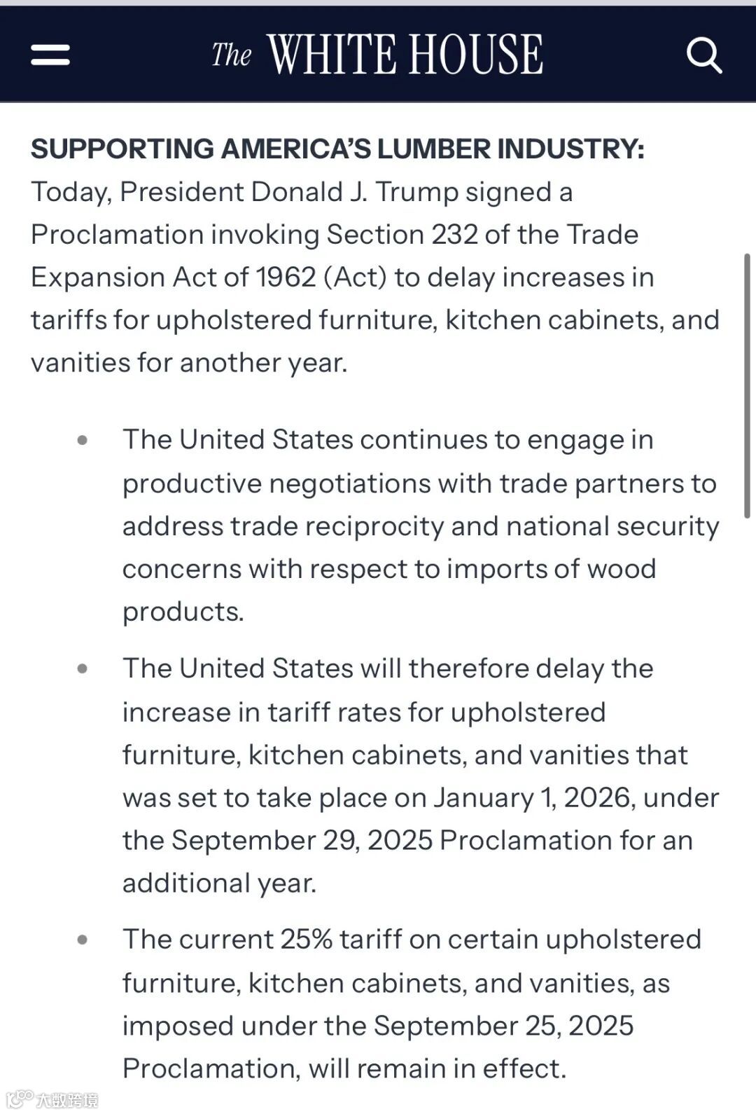 早在2025年9月,特朗普便下令对厨房橱柜和软体家具加征25%的新关税,该措施于10月正式落地执行。按照原计划,到2026年,税率将进一步上调,其中厨房橱柜的关税将升至50%,软体家具的关税将升至30%。(往期推荐:聚焦 | 定了!美国对木材及厨浴产品征收10%-25%关税!一文读懂征税清单、豁免范围及影响)而周三发布的命令推迟了此次大幅上调关税的安排,这意味着目前这些商品的关税仍暂时维持在25%的水平。