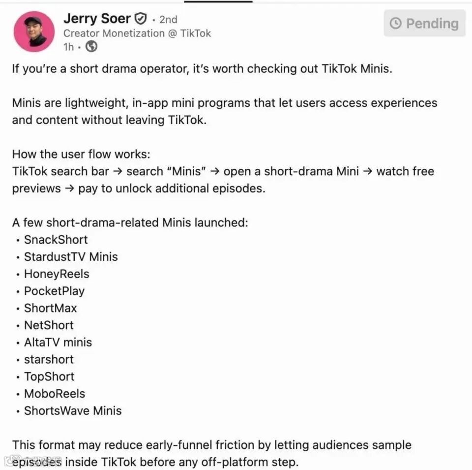 最近,在海外社交网络的一个专业圈子里,一份已被删除的LinkedIn帖子截图正在流传。帖子来自一位TikTok员工,他轻描淡写地描述了一项即将改变行业格局的新功能。
